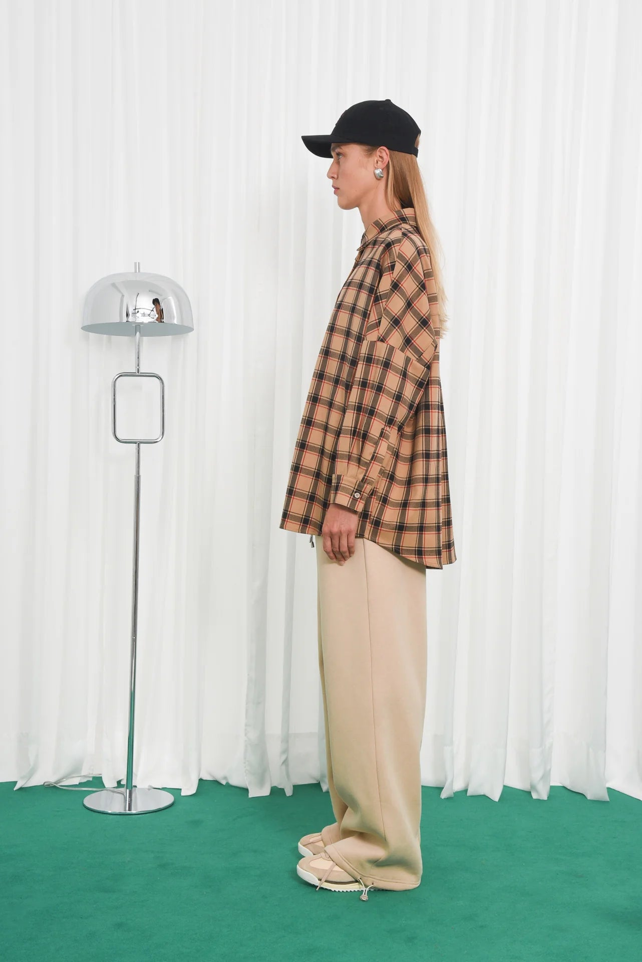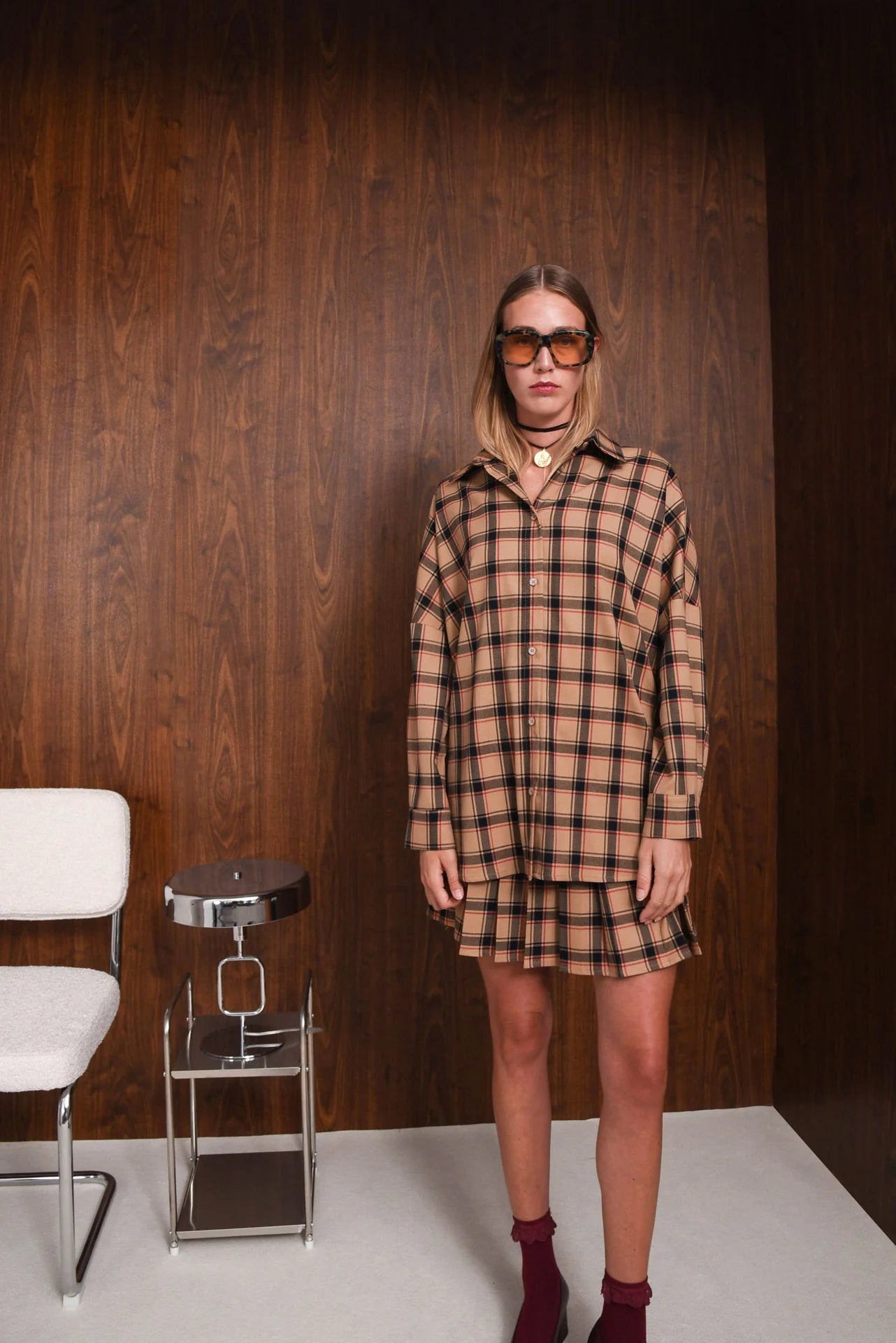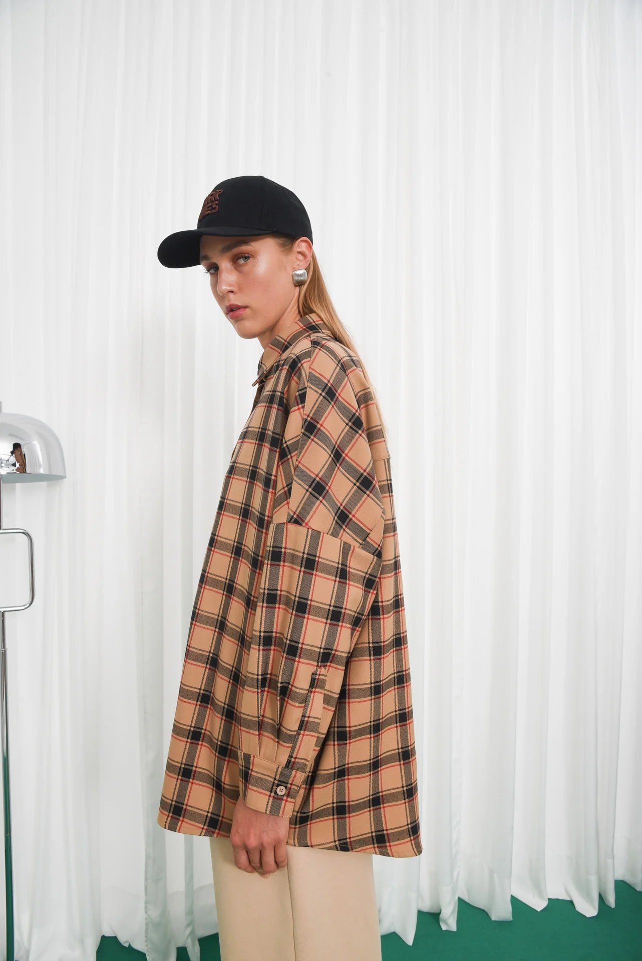 The Affect Shirt features an oversized fit with dropped shoulders, a pointed collar, and a full button-down front. Made from soft checked fabric, it includes long sleeves with buttoned cuffs and a curved hem that’s slightly longer at the back. Comfortable and versatile, it pairs easily with jeans, skirts, or tailored pieces.