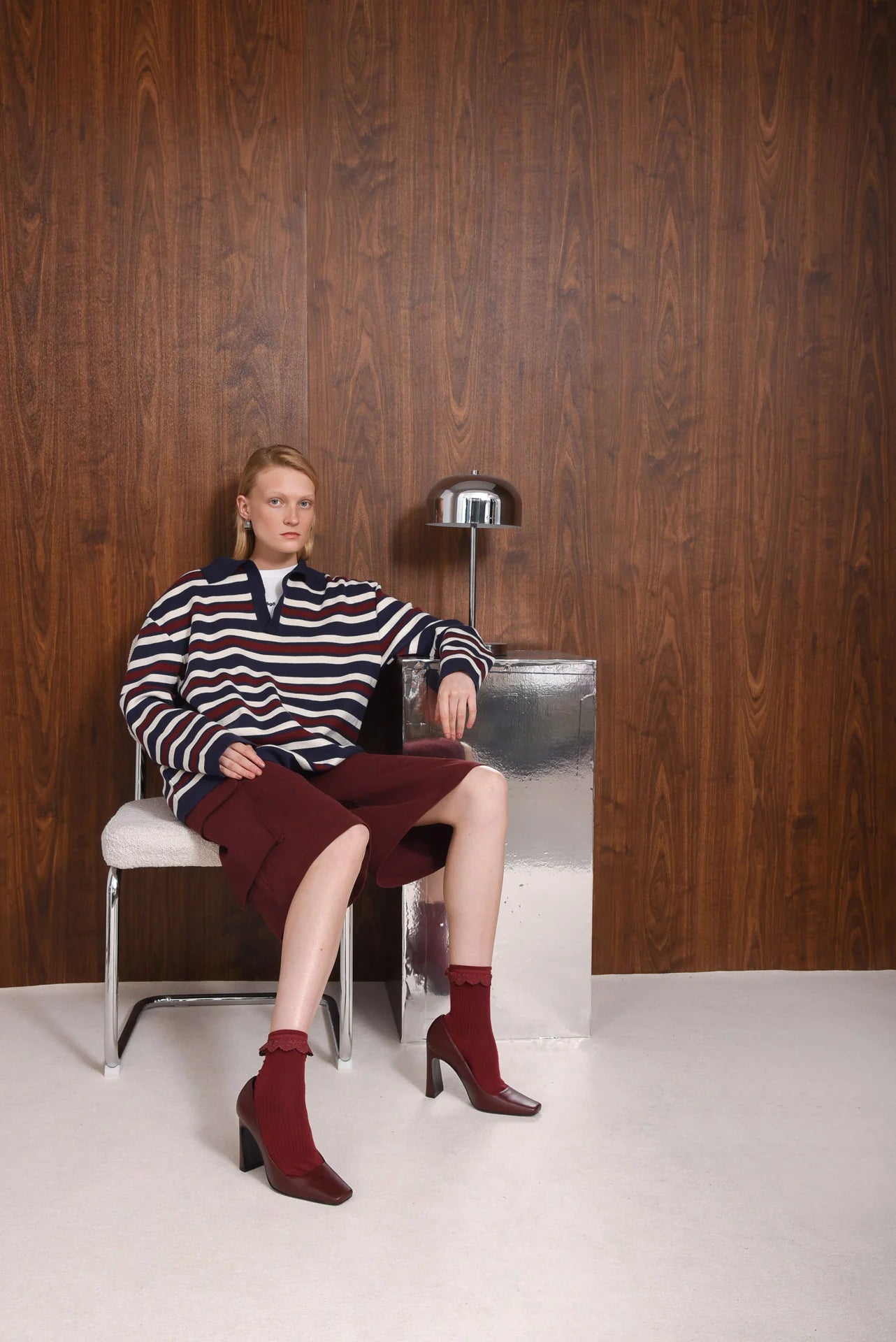 Chase Knitted Polo Blouse, a relaxed-fit polo blouse features bold horizontal stripes in burgundy, cream, and sky blue. Crafted in soft knit fabric, it has a deep V-placket, contrast blue collar, and extended cuffs with shirt-style detailing.