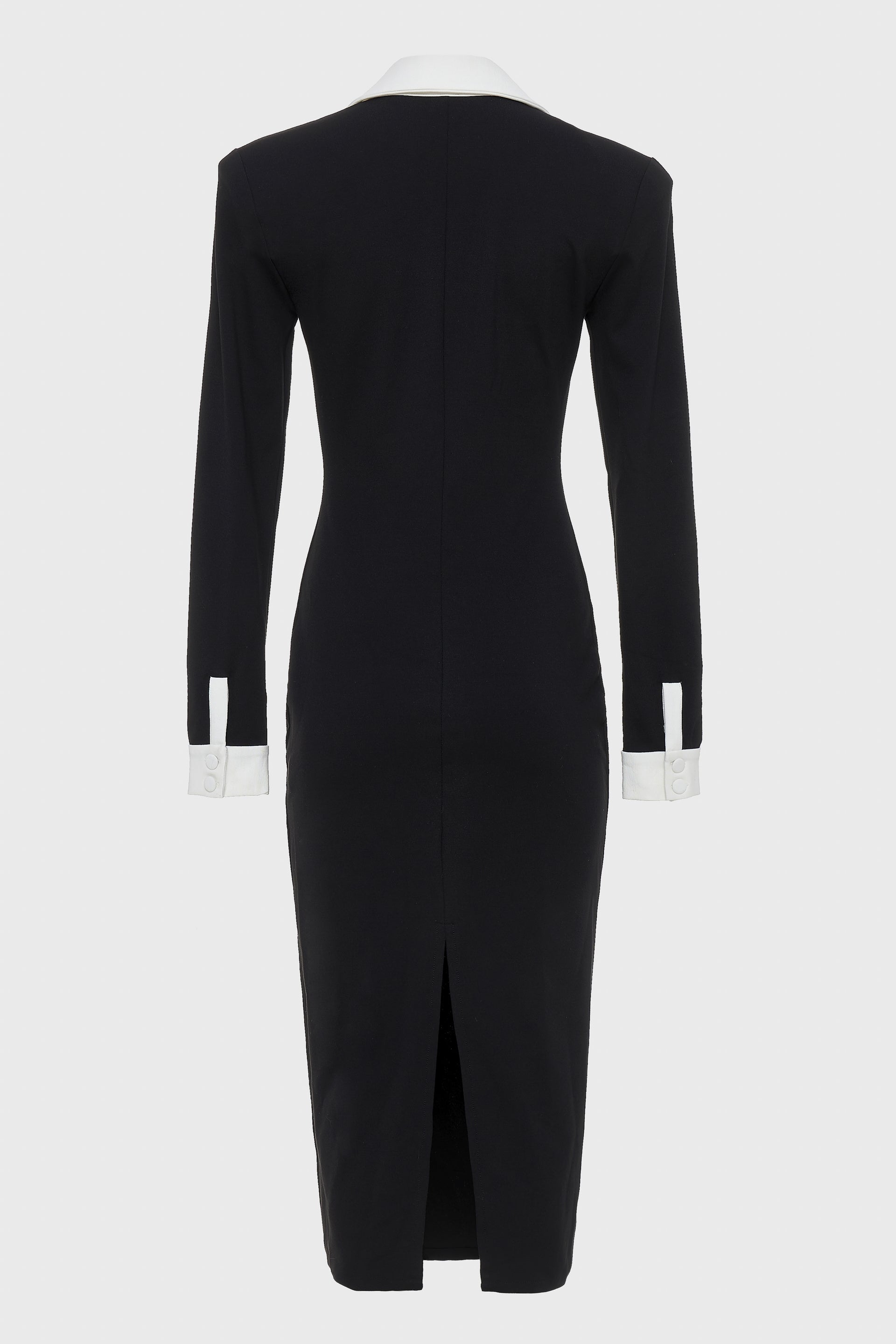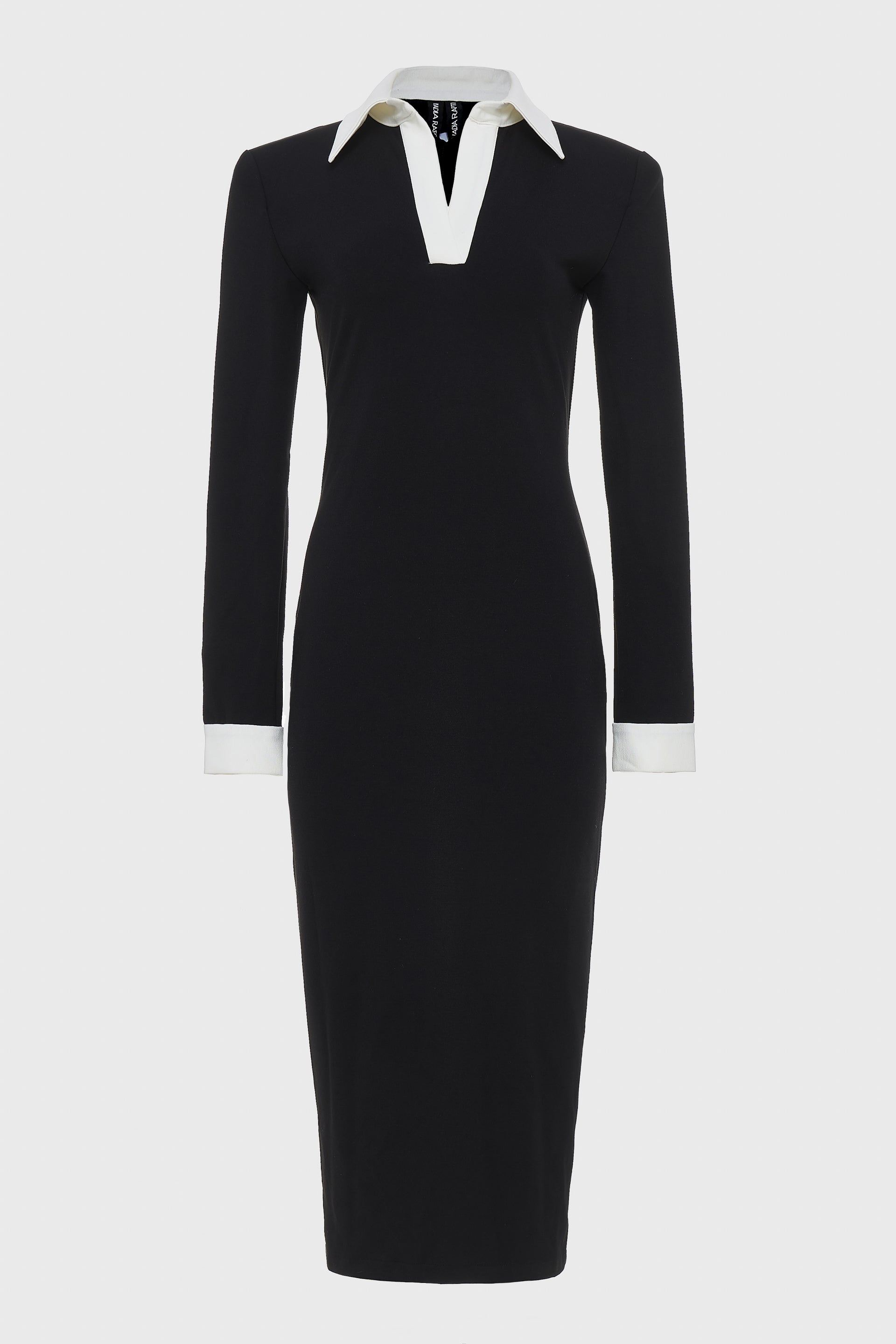A long-sleeved maxi dress crafted from soft jersey punto fabric. Defined by a sharp contrast collar and cuffs, it combines precision and ease in a single gesture. The elongated silhouette follows the body with quiet confidence, while subtle stretch ensures comfort and movement. A modern interpretation of understated sophistication.