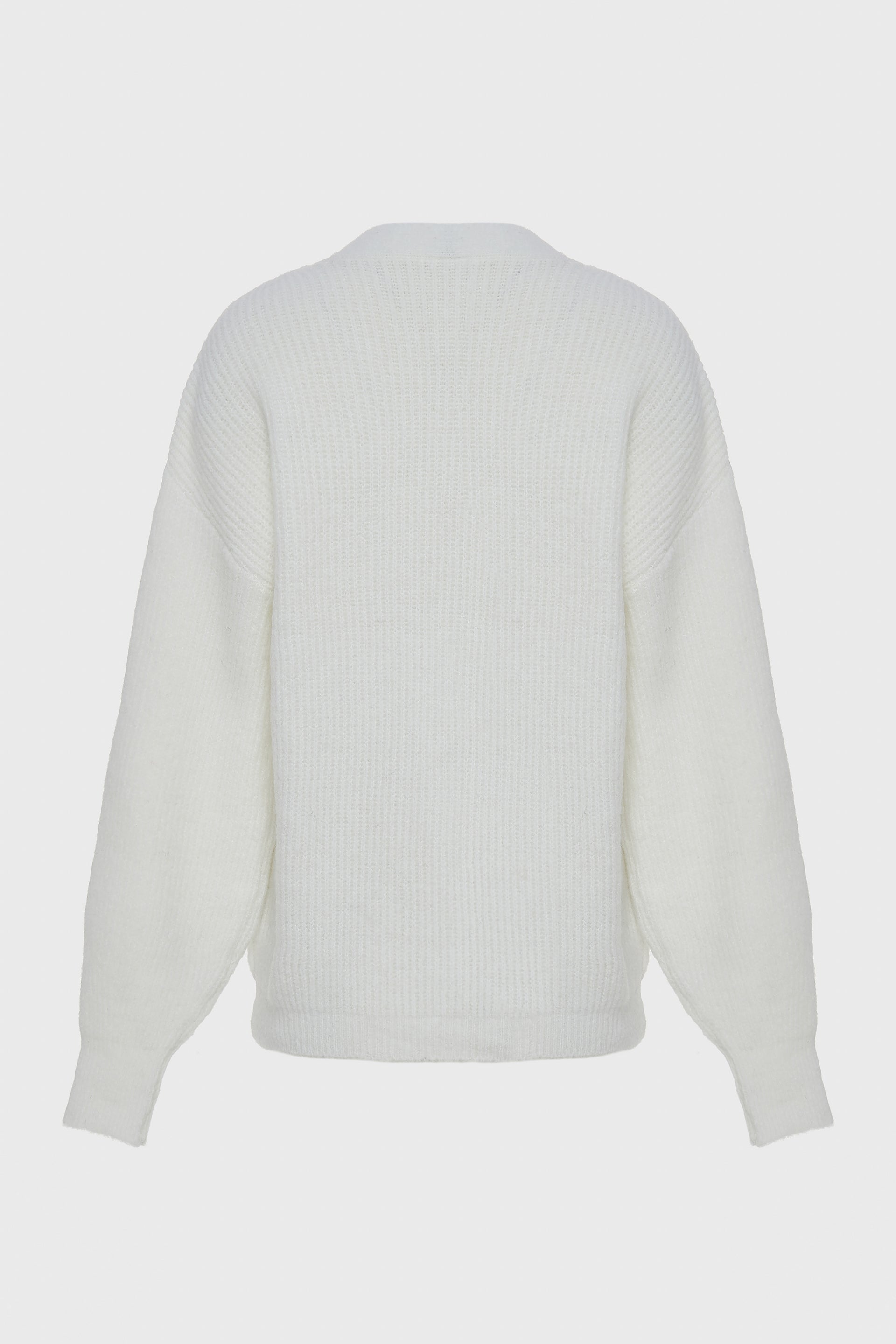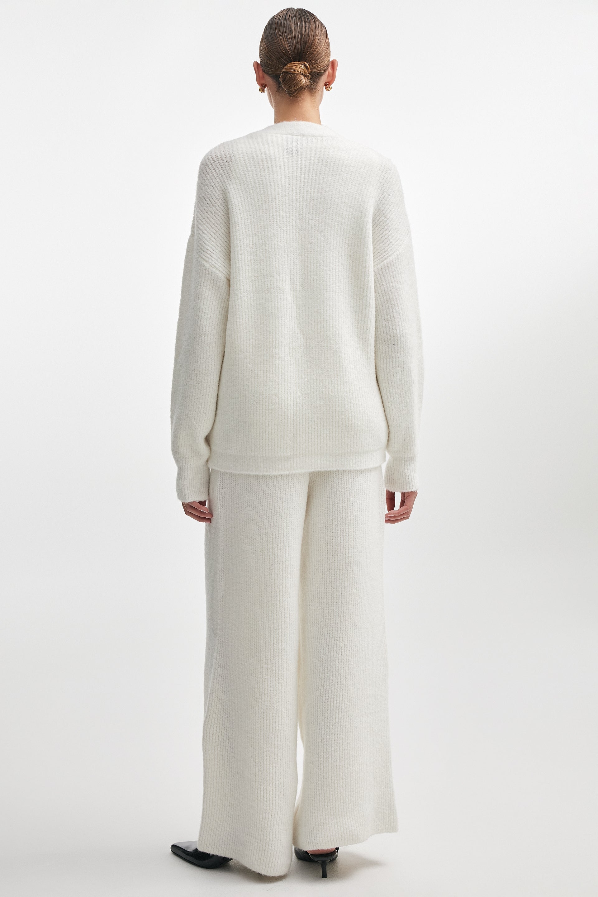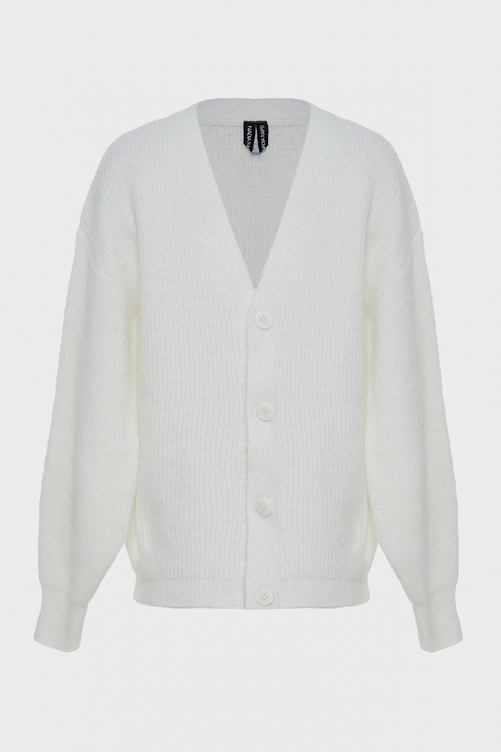 A refined cardigan in a relaxed silhouette. V-neckline with a clean button placket. Ribbed details define the cuffs and hem. A modern essential balancing comfort and quiet polish.