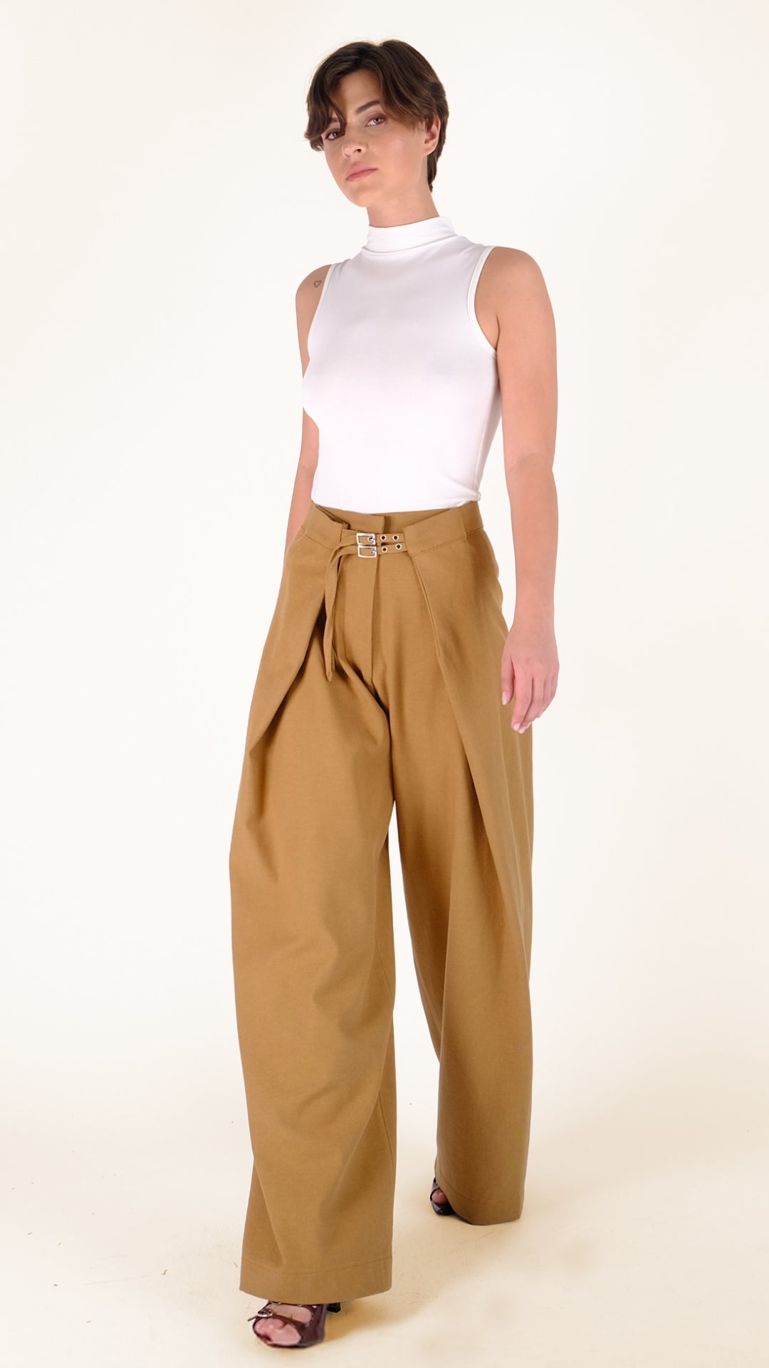 Το Helena είναι ένα ψηλόμεσο παντελόνι με φαρδιά γραμμή και ρυθμιζόμενη μέση που τονίζει τη σιλουέτα. Το ιδιαίτερο μπροστινό του σχέδιο δημιουργεί ένα ρέον αποτέλεσμα, χαρίζοντας φυσική κομψότητα και κίνηση στο look. Ένα διαχρονικό κομμάτι με effortless αισθητική, ιδανικό για κάθε στιγμή της ημέρας.