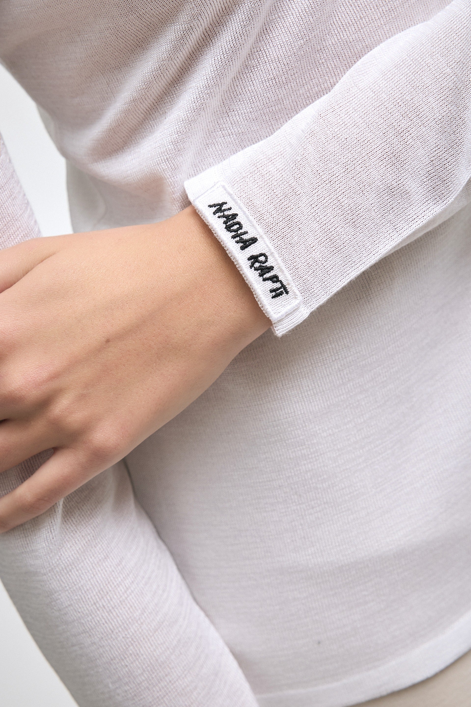 Lightweight high-neck blouse crafted from a shiny fine knit fabric. Designed for a sleek silhouette with subtle stretch and soft texture for all-day comfort. Features discreet logo embroidery on the sleeve. Available in black and white for timeless versatility.