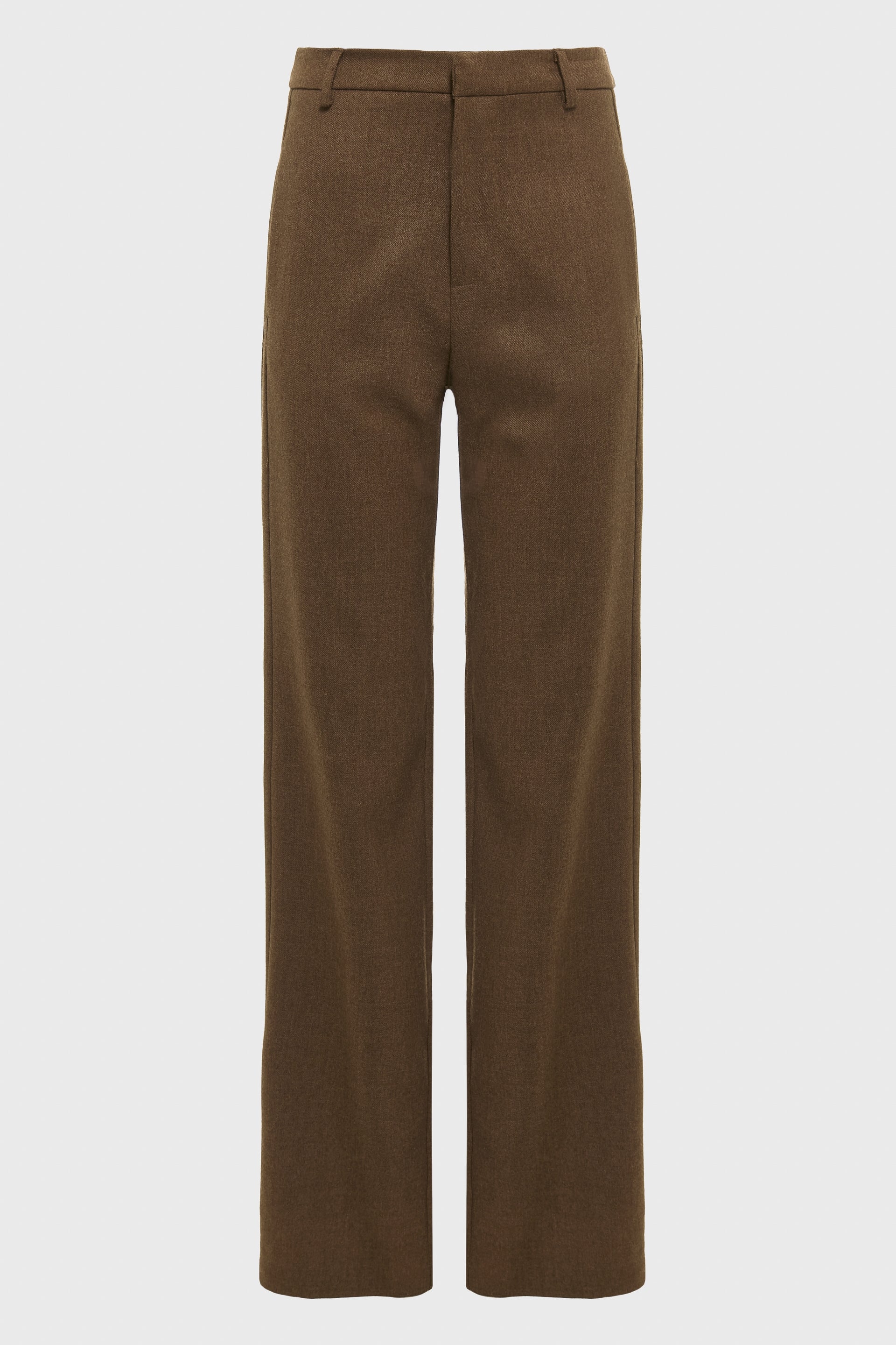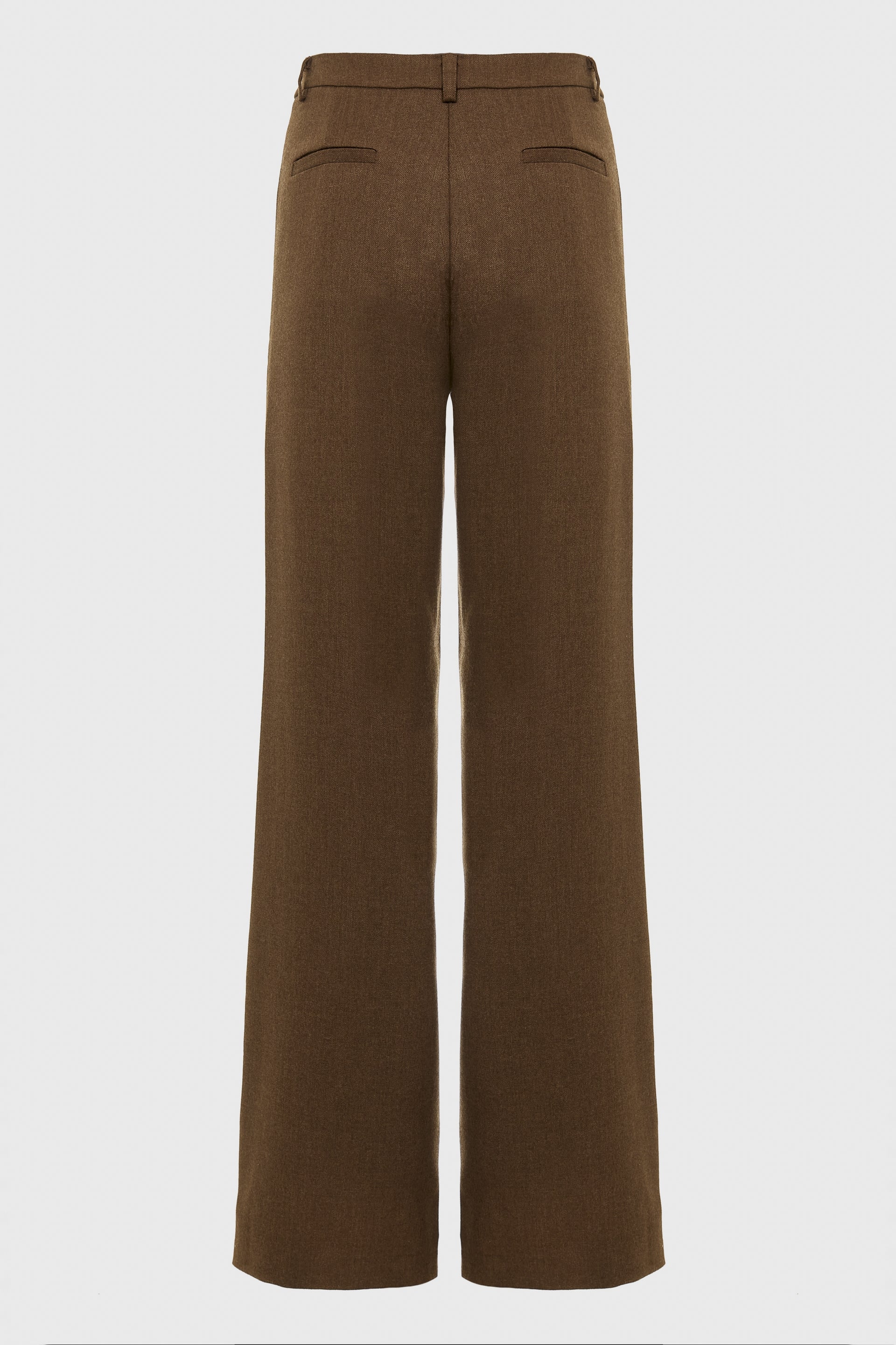 Tailored high-waisted trousers crafted from diagonal weave fabric. Designed with a straight-leg silhouette for a clean and refined look, featuring discreet side pockets and back welt details. Available in brown and navy for a polished, coordinated ensemble.
