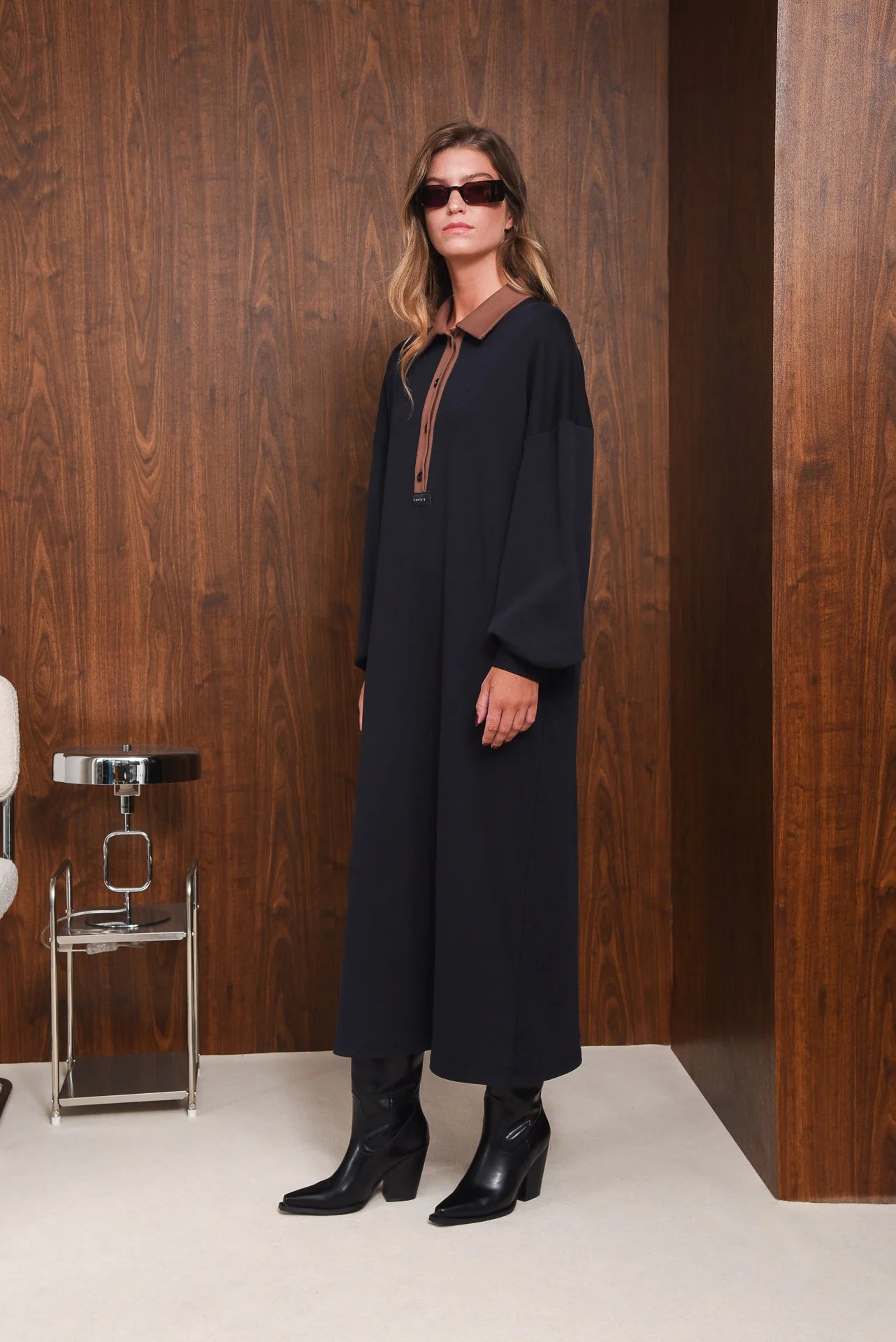 Real dress in blue black features a contrasting brown collar and button placket, long sleeves with buttoned cuffs, and a detachable belt to shape the waist. Made from soft fabric, it offers a relaxed fit that’s easy to wear from day to night.