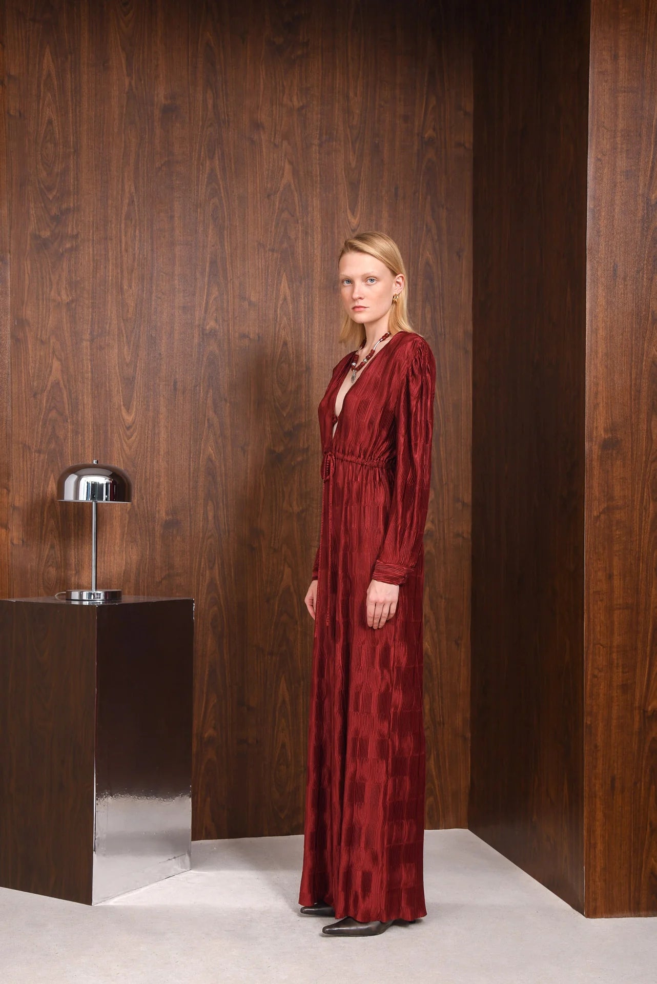 The Role Jumpsuit features fluid wide legs, long sleeves, and a plunging neckline with gathered waist ties for a flattering shape. Its subtly pleated texture elevates movement. Each jumpsuit includes a matching triangle top, perfect for wearing underneath or styled separately.