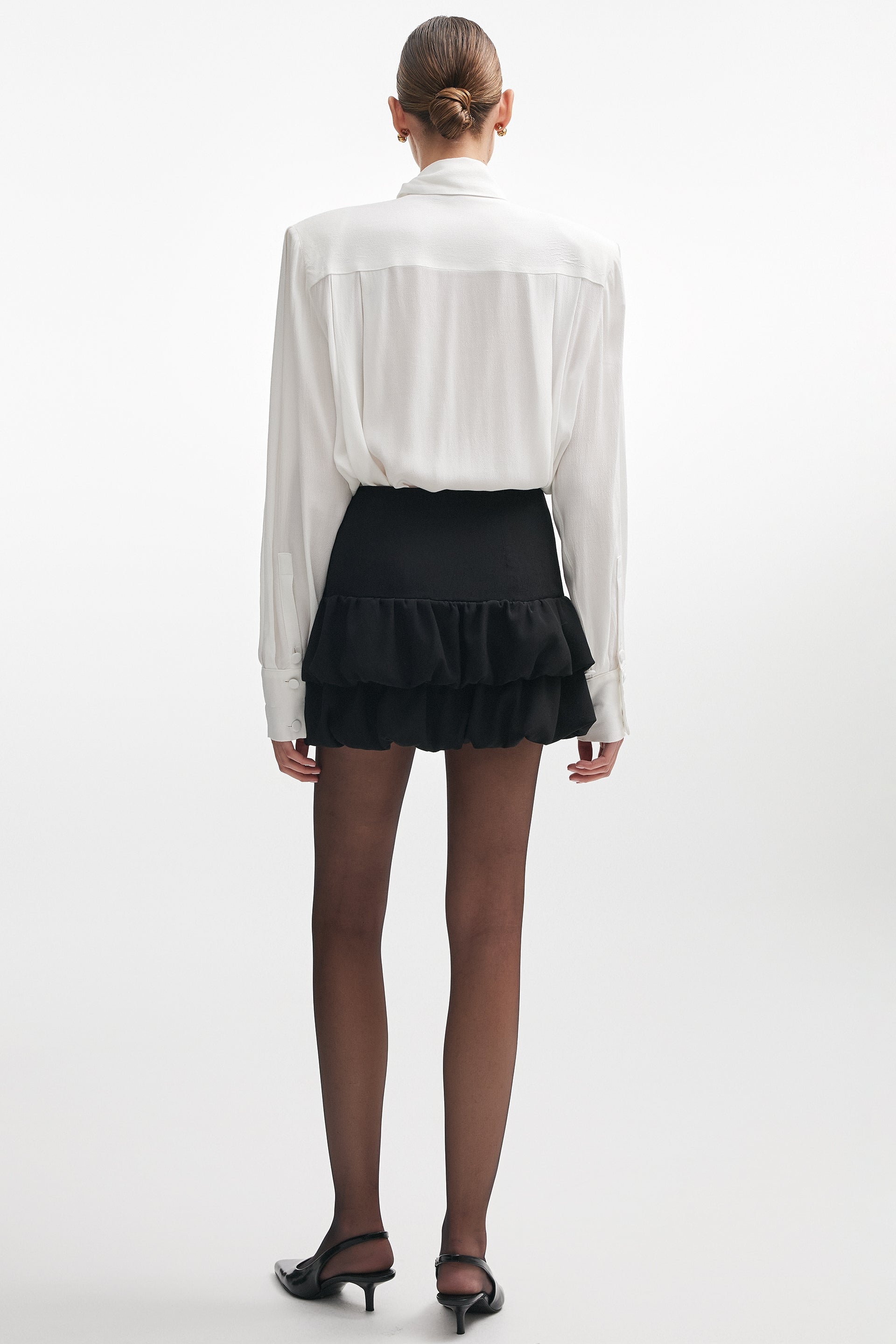 An elegant blouse crafted from a soft rayon-viscose blend, featuring fine pleats and a statement bow tie at the neck. Its fluid drape and lightweight texture make it a refined choice for both day and evening looks effortlessly balancing femininity and sophistication.